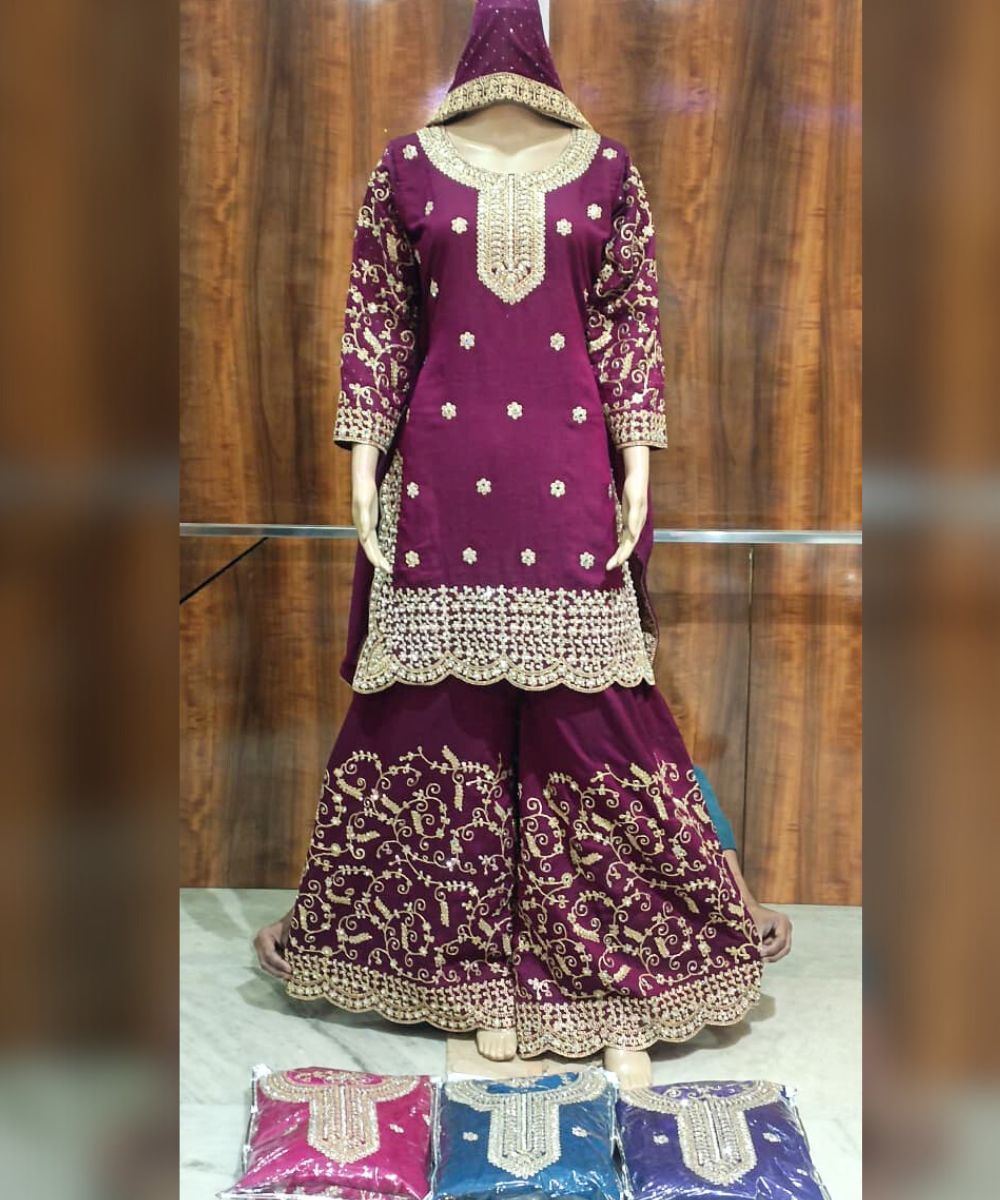 The kurti is beautifully designed with intricate embroidery work on the neckline, sleeves, and hem, adding a royal touch to the outfit. The sharara pants feature all-over embroidery with heavy border detailing, giving the set a grand and luxurious appearance. The coordinated dupatta completes the look, making it a perfect ethnic ensemble.