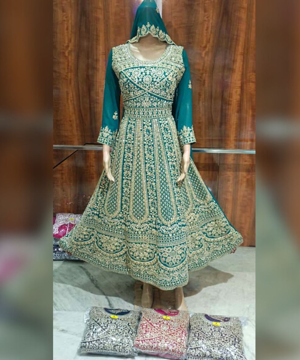 Grand Party Wear Georgette Anarkali Gown with Mirror Work & Embroidery – Teal Green